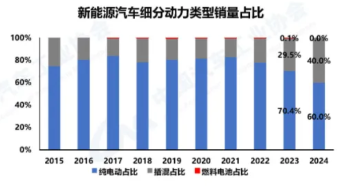高压快充技术加速普及的背景之一,是纯电动车销量增长不及插混。据中汽协统计,2024年国内纯电动汽车销量占新能源汽车比例为60%,但较2023年下降10.4个百分点;插混汽车销量占新能源汽车总体销量40%,但较2023年提高10.4个百分点。
