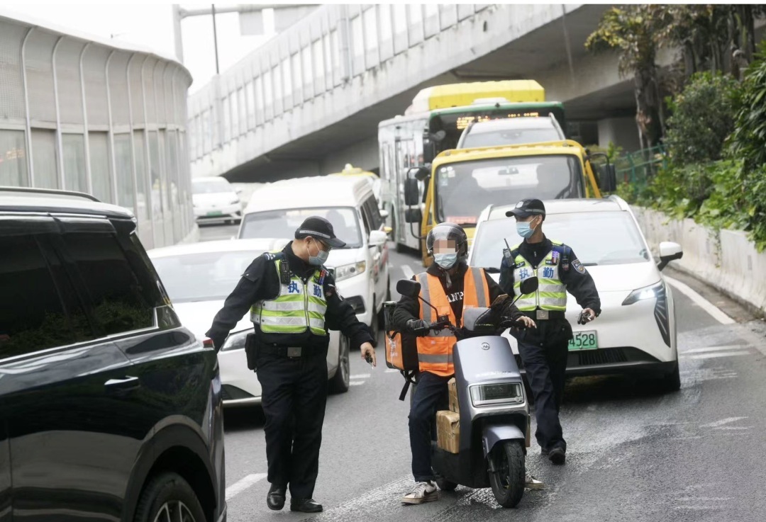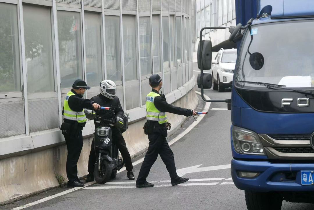 行动期间,少数电动自行车驾驶人在下桥时,看到前方有交警执法,企图掉头逃离均被一一拦下。一名男子强行下桥准备“冲卡”时被执勤交警迅速拦截。