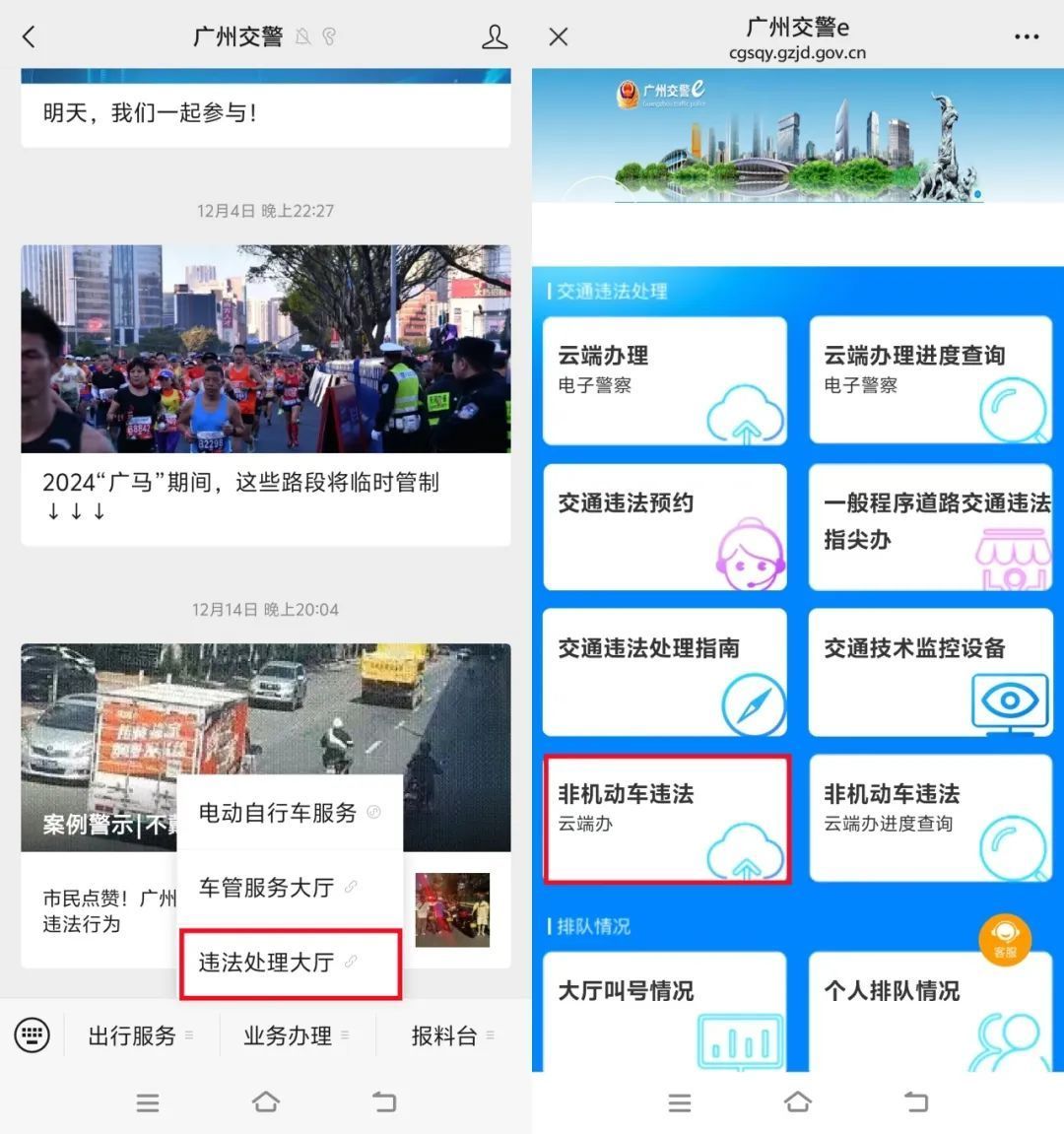 如电动自行车被盗或者号牌被盗,产生的违法并不是本人所为,如何处理?梁警官介绍,对于非本人的违法,可通过“广州交警”微信公众号—“违法处理大厅”—“非机动车违法云端办”进行线上申诉,也可以携带身份证、报警回执等资料前往广州市各交警大队违法处理室进行申诉。
