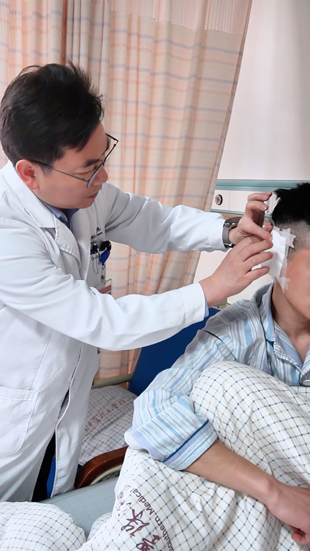 张宏征主任在为人工耳蜗植入者进行术后检查。