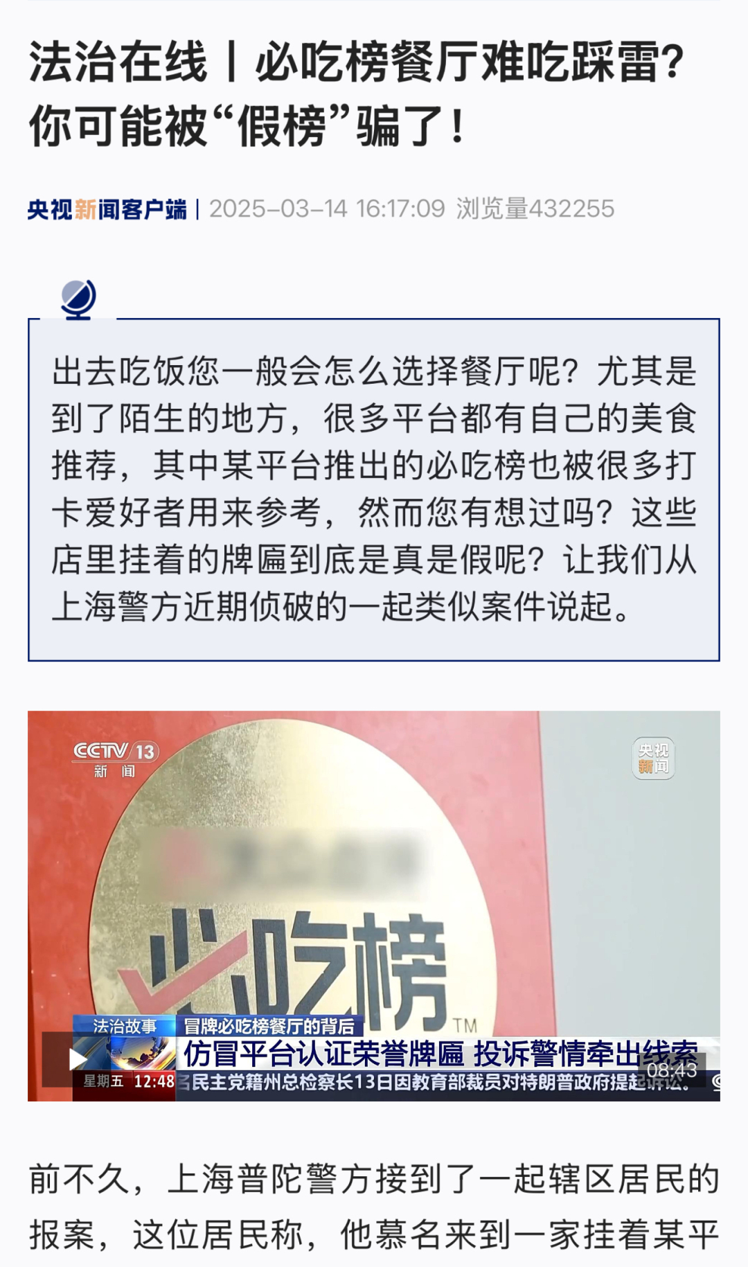 3月18日,记者了解到,央视《法治在线》栏目近日就报道了一起涉嫌销售假冒注册商标的商品罪案件。上海当地警方综合相关平台及市民线索,发现涉事团伙通过某电商网店,累计销售假冒“必吃榜”非法牟利百万元。目前,犯罪嫌疑人因涉嫌销售假冒注册商标的商品罪,已被依法采取刑事强制措施,案件正在进一步办理中。