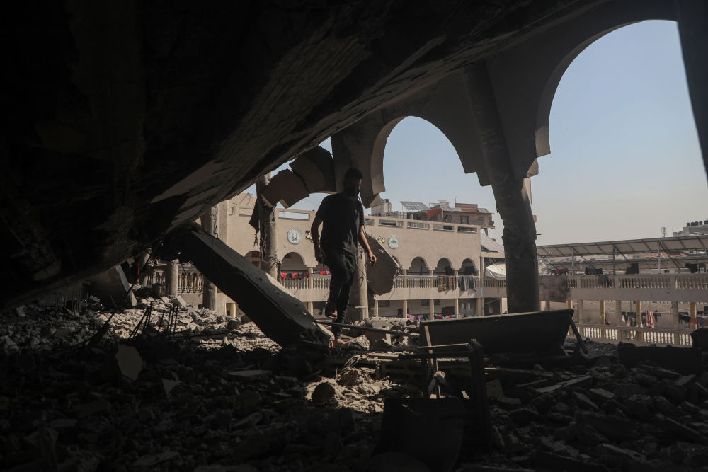 月18日,在加沙地带北部加沙城的一处社区,一名男子查看遭以军空袭损毁的建筑。新华社发(里泽克·阿卜杜勒贾瓦德摄)