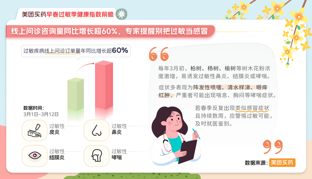 早春过敏季恰逢换季感冒小高峰,两者症状表现类似,不少过敏患者也常把过敏误当感冒治。美团买药数据显示,过敏相关线上问诊订单量年同比增长超60%,过敏性鼻炎、过敏性结膜炎、过敏性皮炎、过敏性哮喘以及区分感冒还是过敏成为用户近期的高频咨询问题。