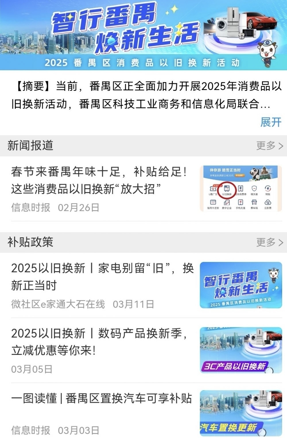 平台设置了多个核心功能模块,全方位服务市民:新闻报道栏目及时更新政策动态与活动进展,补贴政策栏目详细解读消费品以旧换新的补贴标准、申请条件、申请方式等关键信息,活动商家栏目全面梳理并整合番禺区内参与以旧换新活动的汽车4S店、家电卖场、数码产品、家装及电动自行车等各类商家信息,帮助市民更加直观、清晰地掌握以旧换新活动流程与补贴政策,提升市民查询的便捷性,激发市民焕发新潜力。