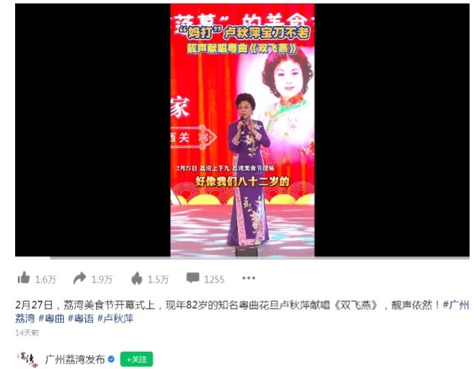 2月28日,“广州荔湾发布”视频号发帖称,2月27日,荔湾美食节开幕式上,现年82岁的知名粤曲花旦卢秋萍献唱《双飞燕》。一方面,荔湾美食节、知名粤曲艺术家影响力叠加实现高热传播。目前,该视频累计已有1.9万转发量、1.6万点赞量,视频热度达1.5万。另一方面,借由美食及粤语粤曲传承提高本地文化认同感。如“在珠海,怎么去美食节呢”“太好听了,粤曲应该得到推广,传承”等内容热度位居评论区前列。此外,“广州荔湾发布”视频号于2月12日、18日发布的《合唱国家队唱响粤语歌,国家大剧院合唱团震撼演绎<海阔天空>》《唱响粤语版<我和我的祖国》,向祖国深情告白》等传播粤曲歌曲视频,分别有6.6万、3.2万点赞量,共同带动广州荔湾发布位居本月广州政务微信视频号榜首。