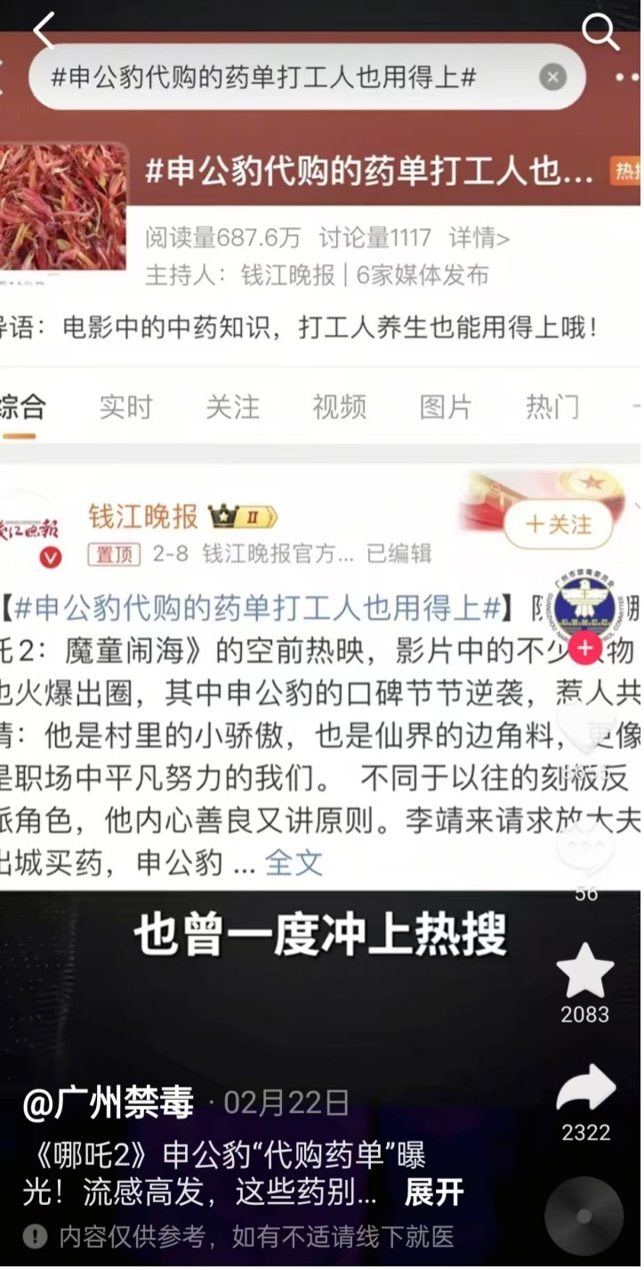2月22日,“广州禁毒”抖音号发布视频《<哪吒2>申公豹“代购药单”曝光!流感高发,这些药别乱吃!》,进行禁毒宣传。一方面,借势影片热度,契合打工人保健养生心态。该视频介绍申公豹代购药品名及其功效等中药知识,并称“打工人”保健养生也能用得上,切中当下职场年轻人养生热点,收获点赞、收藏量累计超万次。另一方面,关注流感高发,普及科学用药知识,取得良好科普效果。该视频还关注近期多地进入流感高发期,网民多用复方甘草片止咳。视频重点普及长期过量服用复方甘草片的危害、部分感冒药不能混用等知识,提醒公众应在正规医院的医生处方下按正常剂量服用。网民纷纷跟评反映其用药不良反应、家中老人混合用药,并呼吁按医生、药剂师医嘱用药。