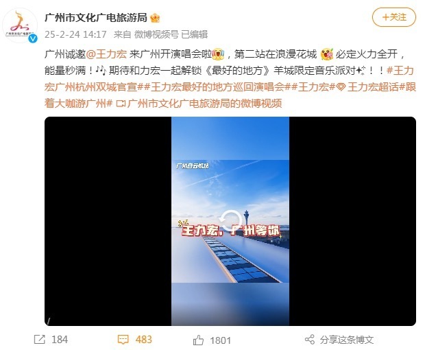 2月24日,“广州市文化广电旅游局”微博号发布帖文、视频,预热宣传王力宏2025年巡回演唱会第二站落地广州,并借此宣传广州文旅资源。