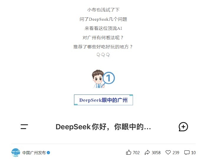 2月8日,“中国广州发布”微信公众号发布文章《试过了,DeepSeek还是懂广州的》,呈现用DeepSeek推荐广州特色资源的对话全过程。