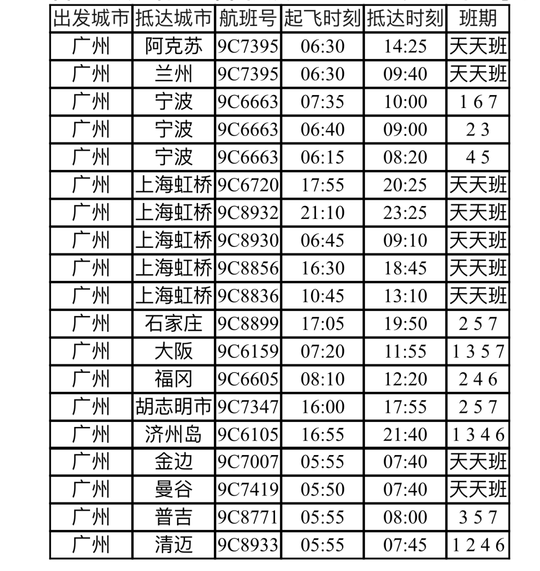附:春秋航空广州进出港航线时刻表供参考,具体班期请以春秋航空APP、小程序为准。