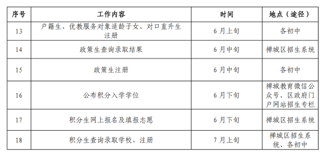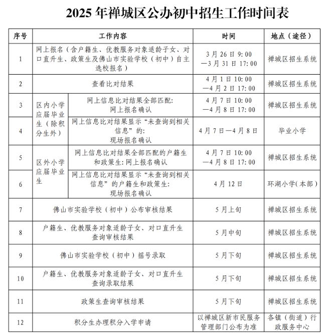 在招生日程安排方面,户籍生、对口直升生、政策生在3月26日-3月31日进行网上报名。未达到政策生条件的,请家长按时办理积分入学申请或回户籍地接受义务教育。通过积分入学排名取得入读禅城区公办初中资格的积分生于6月下旬进行网上报名。