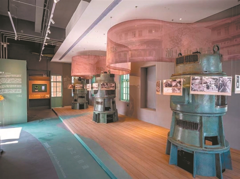 从地铁11号线大冲口站C口出来,是涌口电排站的活化空间。鹤洞公社涌口电排站建于1962年,是人民公社时期重要的水利建筑。该空间在今年初完成活化修缮,由大冲口历史人文展和咖啡馆组成,目前已对公众开放。大冲口历史人文展规模不大,内容设计却十分精巧。大门口矗立着三台绿色的立式轴流泵机,还原了电排站当年机器轰鸣、运转排涝的历史。顺着河道流向设计的动线,沿岸景观仿佛述说着聚龙湾的历史:聚龙古村邝氏家族在这里开创了广东最早的房地产开发模式;清代文学家招子庸的《粤讴》曾风靡一时,堪称“顶流”;生菜会等民俗活动重现岭南风情……大冲口涌边,古老的屋檐下溢出咖啡香气,街坊坐在榕树下的长椅上休息,“桥街水市,船埠码头”,胜景再现。未来,片区将联动协同和机器厂、日清仓等10处历史建筑,打造“工业遗址+艺术展厅+商业街区”复合空间。