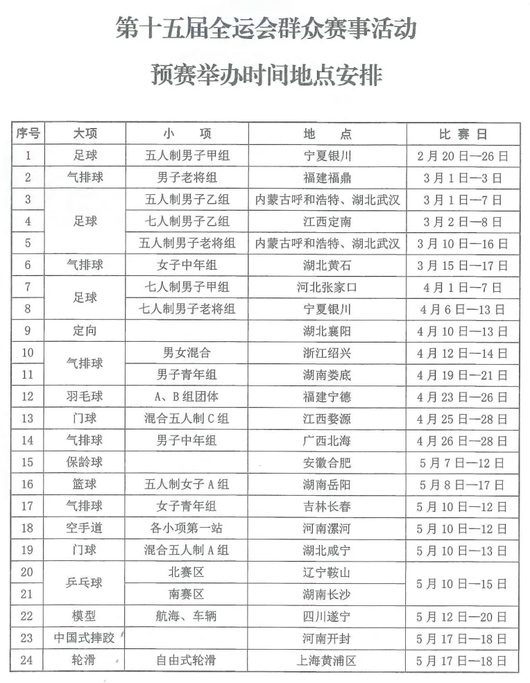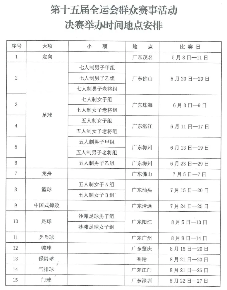 今天,广州日报新花城记者从十五运会广东赛区执委会获悉,经国家体育总局确认,第十五届全国运动会群众体育赛事活动预赛、决赛举办时间地点已经全部确定。十五运会群众赛事预赛已于2025年2月20日在宁夏银川正式拉开帷幕,首个群体赛事活动决赛将于5月8日在广东茂名开赛。