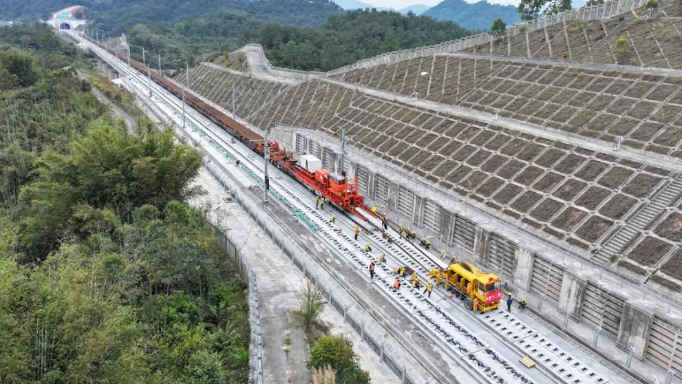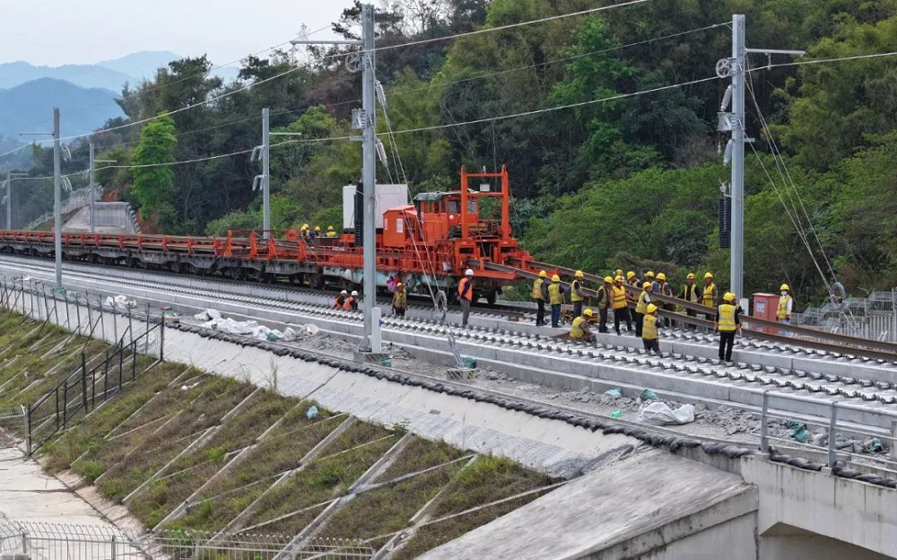 在新兴段施工现场,记者看到,施工人员正把长达500米的钢轨缓缓铺设在无砟道床上,铺轨工程紧锣密鼓地进行中。