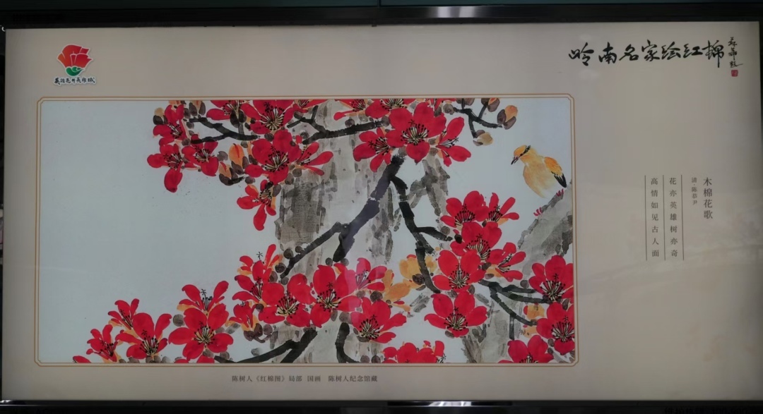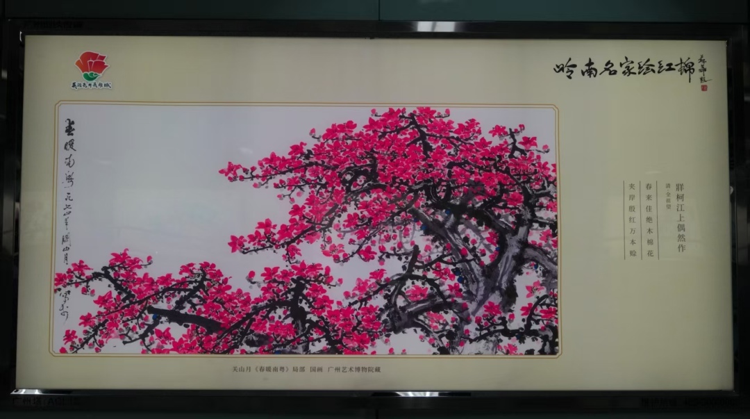 广州美术学院教授、广东省政府文史研究馆书画院副院长梁如洁的画作《南国雄风》于2013年被收藏于北京人民大会堂,如今,画作局部在广州塔地铁站A出口展出,来往市民可一睹雄伟大气的木棉风采。“我和广大市民一样生活在木棉花下,能将我的画作和广大市民分享,我感到很幸福。”梁如洁说。