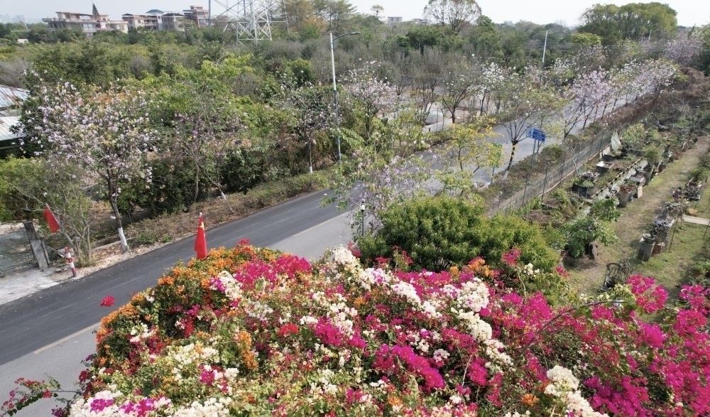 蔡一村黄花风铃木沿路盛放,海傍水乡的油菜花吸引了大批市民打卡,大刀沙村中心公路变身粉色花廊;新桥村木棉花正以其独有的热烈与豪迈姿态尽情绽放……阳春三月,草长莺飞,当下广州番禺的乡村被五彩斑斓的花朵装点得如诗如画。