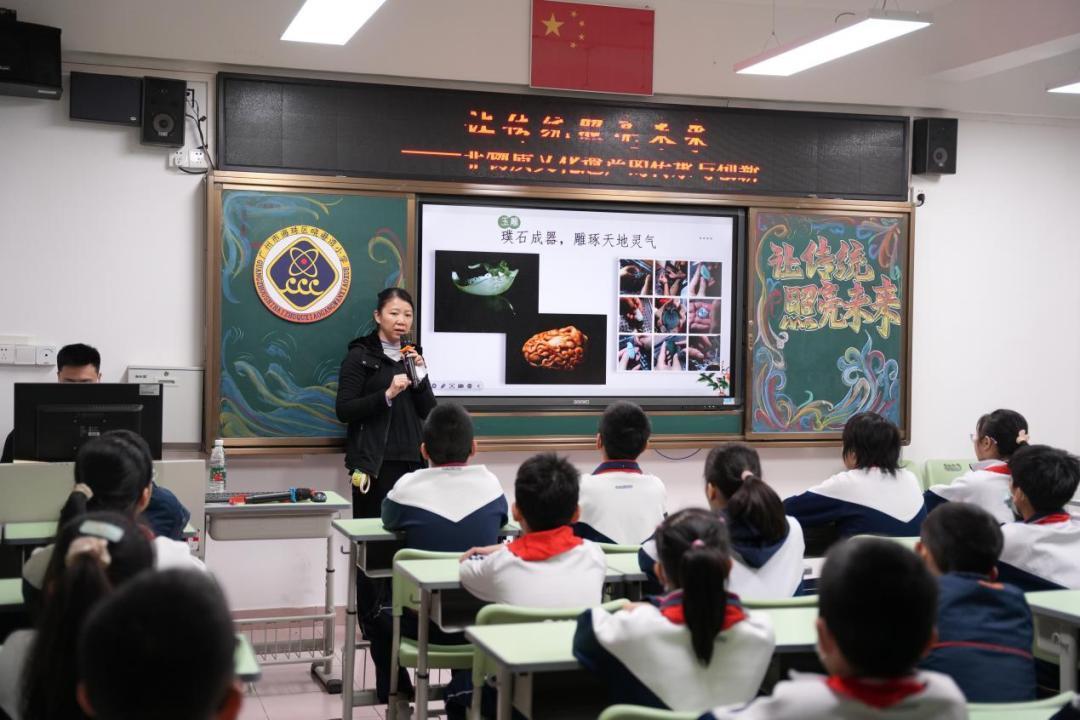 广州市非物质文化遗产传承基地的负责人毛沛华老师为学生们开启了一扇通往传统艺术世界的大门。她深入浅出地讲解了“三雕一彩一绣”的独特工艺和艺术价值,让学生感受岭南工艺的“指尖美学”,让同学们直观地认识到这些传统技艺的精湛与美妙。