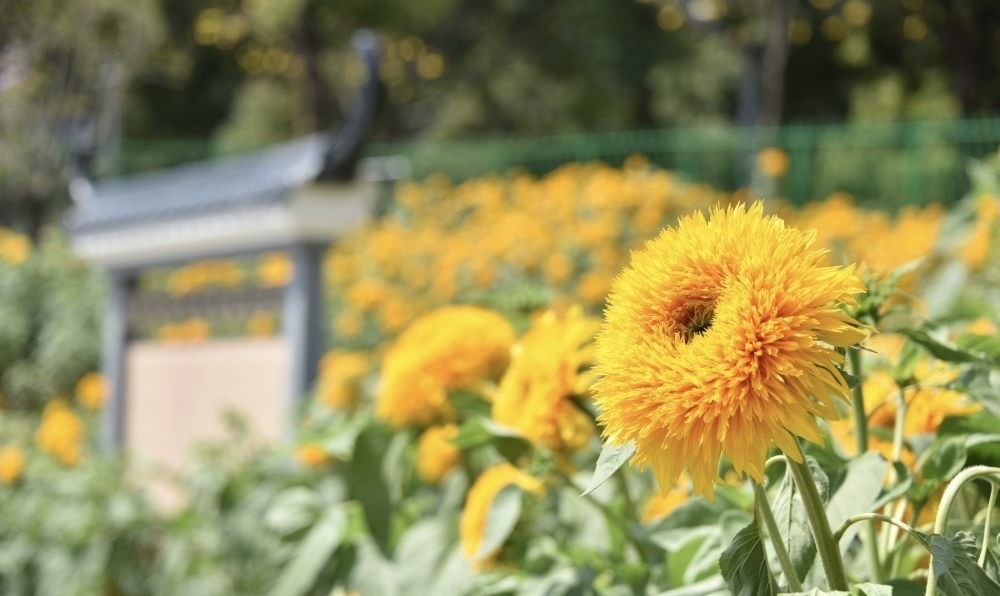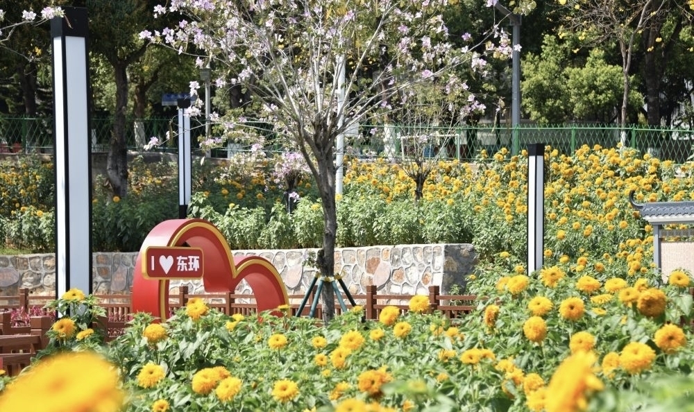 泰迪熊向日葵花盘是重瓣结构。 这片令人陶醉的泰迪熊向日葵花海,是去年12月播种的,经过园林绿化工人的悉心照料,终于在今年3月迎来了绚烂的开花期。为了方便市民们近距离欣赏并拍照留念,东环街特意在花海中铺设了蜿蜒的石板路,并精心设置了多处打卡点,让街坊们能够与这片花海亲密接触,尽情捕捉春日的美好瞬间。