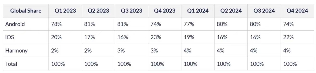 2023年Q1—2024年Q4,鸿蒙操作系统的全球市场份额