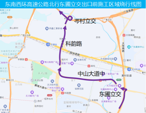 ①原东南西环高速公路北行的车流,提前从东圃立交出→中山大道中(西行)→科韵路(北行)→岑村立交到广州环城高速。