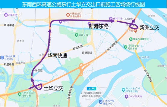 ②原东南西环高速公路东行的车流,提前从土华立交出→华南快速→新港东路→新洲立交进入东南西环高速公路继续东行。