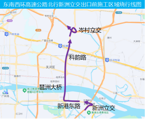 ②原东南西环高速公路北行的车流,提前从新洲立交出→新港东路(西行)→琶洲大桥→科韵路→岑村立交进入广州环城高速。