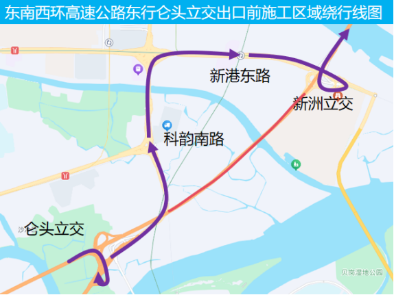 ①原东南西环高速公路东行的车流,提前从仑头立交出→科韵南路→新港东路→新洲立交进入东南西环高速公路继续东行。