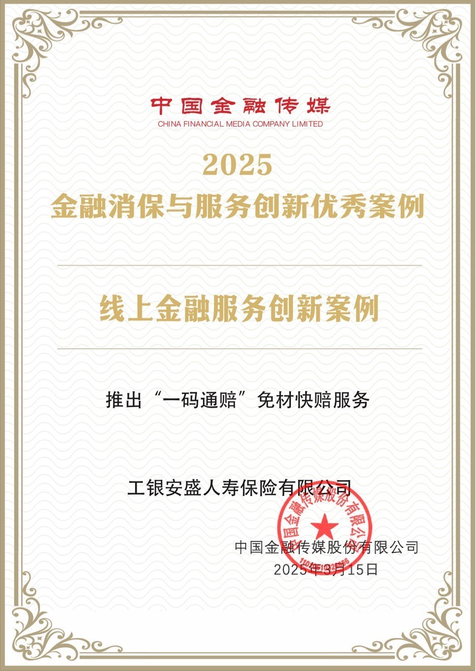 3月15日,中国金融传媒成功举办“保障金融权益 助力美好生活”2025金融消保与服务创新主题直播活动。期间正式发布了2025金融消保与服务创新优秀案例名单,工银安盛人寿凭借“一码通赔”免材快赔服务成功入围线上金融服务创新案例。