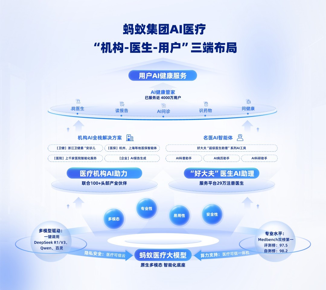 行业观察人士称,目前蚂蚁集团在AI医疗领域以医疗大模型为核心,形成了“医疗机构—医生—患者”的三维服务体系,打通了医疗AI从诊疗、服务到健康管理的闭环,为医疗健康产业探索打造安全可信的AI应用做出有益探索。