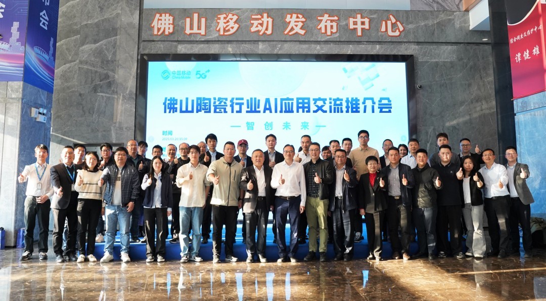 3月20日下午,“智创未来·陶瓷行业AI应用推介会”在佛山移动信息大厦盛大举行。本次活动由佛山市工业和信息化局、佛山市委网信办指导,佛山市陶瓷学会主办,佛山市信息协会和佛山移动协办。活动汇聚了蒙娜丽莎、新明珠、欧神诺、东鹏控股、宏宇陶瓷、金意陶、兴辉陶瓷、安华陶瓷、佛山科勒等数十家陶瓷企业,以及科达制造、启明星辰、华为公司、美云智数、金蝶软件、众陶联、筷子科技、米仓智库、致远互联、灵泽万川等十多家AI科技公司共同参与。活动通过主题演讲、行动计划发布、圆桌对话等形式,共探人工智能与陶瓷产业的深度融合路径,为传统制造业转型升级注入新动能。在推介会上,佛山市陶瓷学会和佛山移动正式发布“智造升级·陶智未来——AI赋能陶瓷行业行动计划”,以中国移动5G-A、万兆光网及千卡万卡池算力为技术底座,推出包括产业调研、供需对接、技术交流、标杆打造、生态共建在内的“五大行动”,以AI加速赋能陶瓷行业数字化转型。