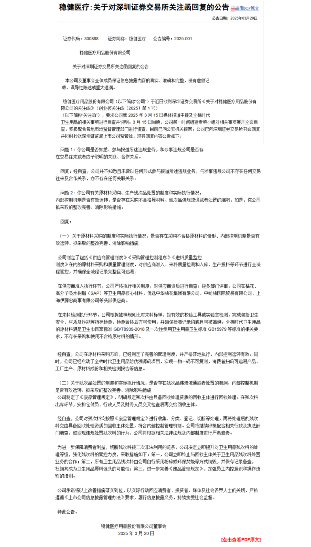 今年央视3·15晚会上,曝光了某纸制品公司非法翻新卫生巾和纸尿裤的违规行为,间接提及多个知名品牌。3月20日,全棉时代母公司稳健医疗针对深圳证券交易所的关注函作出回复: