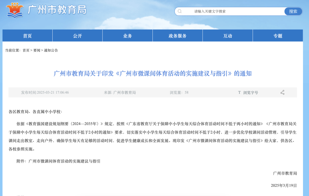 3月21日,广州市教育局官网发布关于印发《广州市微课间体育活动的实施建议与指引》(以下简称《指引》)的通知。《指引》为学校提供了微课间“花式玩法”参考,涵盖活动目标、实施原则、活动内容、组织实施、活动保障、评价反馈等方面。值得一提的是,“木头人”“老鹰捉小鸡”“丢手绢”“红绿灯”“丢沙包”等传统游戏上榜,成为《指引》推荐的微课间活动内容。