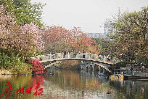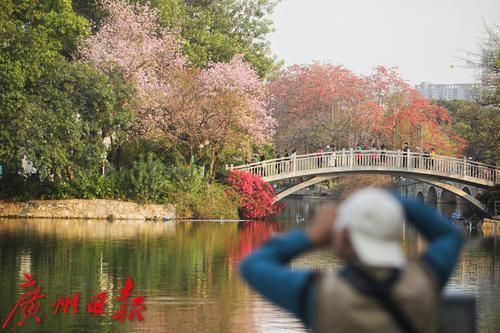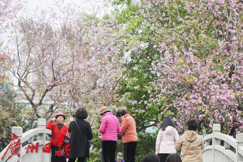 宫粉紫荆位于公园中半岛附近,与周边的小桥和木棉花、勒杜鹃形成美丽的精致。