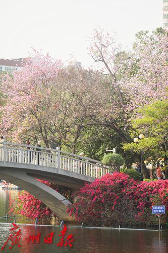 宫粉紫荆位于公园中半岛附近,与周边的小桥和勒杜鹃形成美丽的精致。