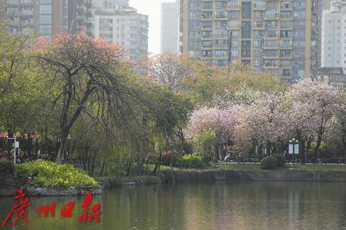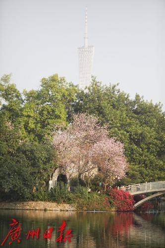 宫粉紫荆位于公园中半岛附近,与周边的小桥和木棉形成美丽的精致。