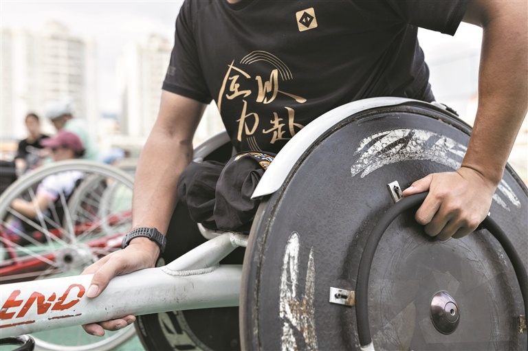广东省铁人三项队轮椅组运动员张健结束“跑步”(竞速轮椅)训练后在田径场一侧休息。
