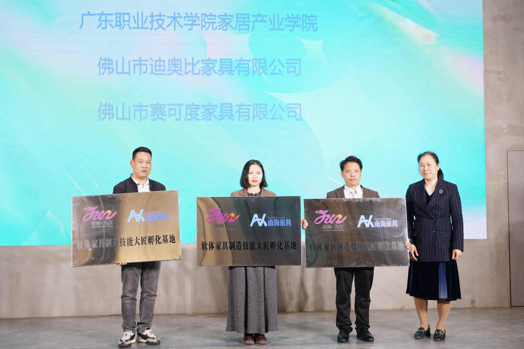当日,主办方还为广东职业技术学院家居产业学院、佛山市迪奥比家具有限公司、佛山市赛可度家具有限公司授予软体家具制造技能大匠孵化基地牌匾,构建起校企协同育人机制。