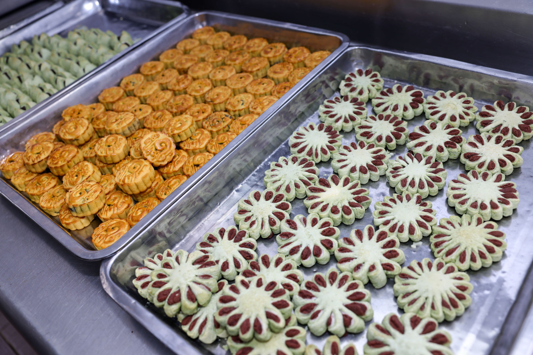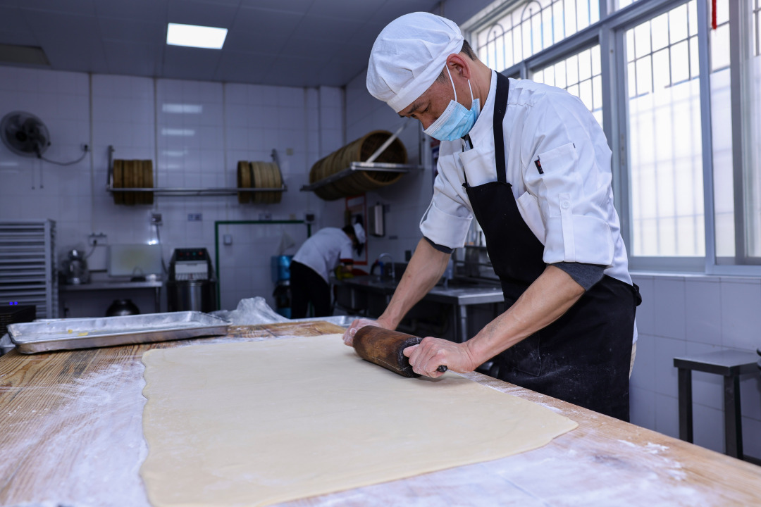 在北京的时候,受到设备和食材的限制,何正路只发挥出五成功力。回到二沙主场,他与其他点心师傅在点心房尽展所长,推陈出新,传统的虾饺、烧卖、豆沙包、蛋黄酥、鸡仔饼、糖沙翁一直保持水准,努力开发的黄油曲奇、芒果布丁、慕思蛋糕、泡芙等西式甜点大受欢迎。早班需要5点到岗,何正路4点30分出门的时候,天都没亮。“我们的面包和点心都是纯手工、无添加,每天一早制作,让运动员们7点多吃到新鲜出炉的早点。”传统糕点的制作手艺都是老一辈点心师傅传承的,何正路甚至还会做天鹅酥,后来得知运动员们很希望在餐厅更多西式品种,他又通过自学,改良出适合他们的甜点。餐厅的黄油曲奇很受欢迎,原材料包括进口黄油,还减了糖,入口香浓酥脆。“红豆馅儿、紫薯馅儿、冬瓜蓉、肉馅儿,甚至鸡仔饼里的‘冰肉’馅儿,都是我们自己做的。”何正路从冰柜里端出一盆白砂糖,从中翻出一块块正在腌制中的“冰肉”。经过糖和酒腌制一个星期,这些“冰肉”才被做成鸡仔饼。