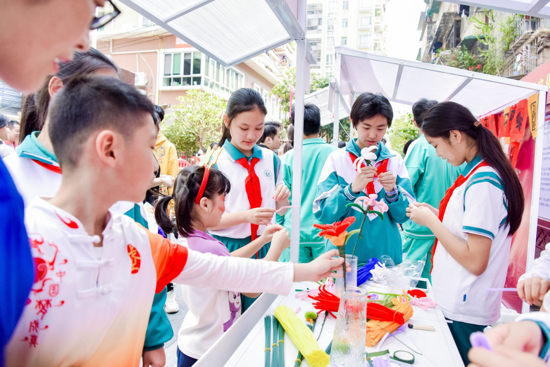 广州市南武中学、绿翠现代实验学校、景中实验中学、江南外国语学校、五中滨江学校、海珠工艺美术职业学校的同学们带来木版年画、手工绒花、漆扇、特色剪纸、中药香囊、粘土、漆艺等传统气息浓厚的手工艺品。众多创意集市摊位让红色文化以一种全新形式呈现,让文、商、旅融合发展动力更强。