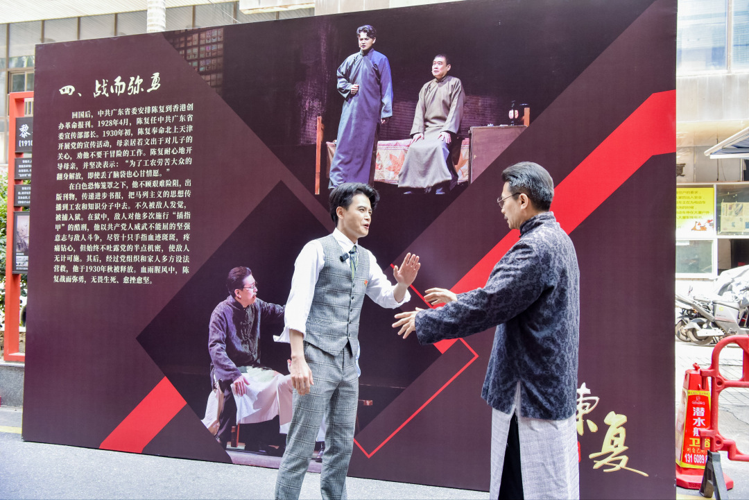 “同志,我们要实行革命运动,打倒一切军阀势力!”陈复烈士红色文化街区内,一名身穿黄包车工人衣服的青年一边散发传单,一边向周围人疾呼。原来,这是一场还原陈复烈士生前工作场景的沉浸式戏剧快闪。戏剧快闪还原了陈复烈士宣传革命思想的场景,演员与观众即兴互动。