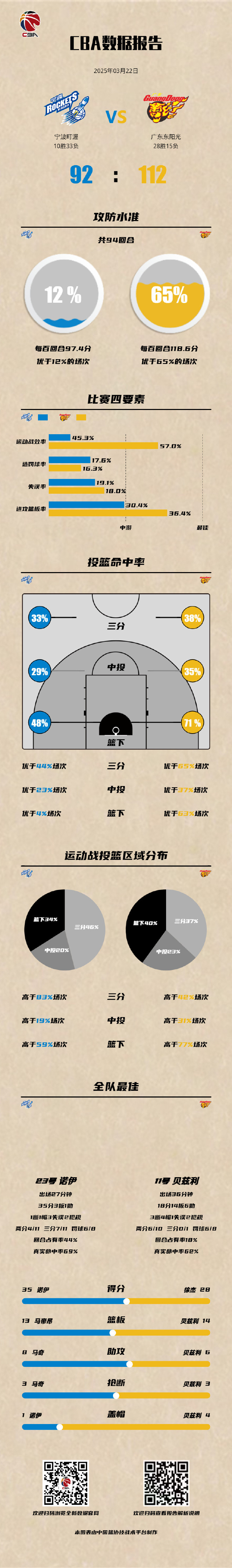 进入第四节,广东东阳光队没有给对手任何机会,多点开花,帮助球队将分差拉开到20分以上。宁波町渥队在进攻端失误增多,防守端也难以抵挡广东东阳光队的攻势。最终,广东东阳光队以112比92拿下胜利。