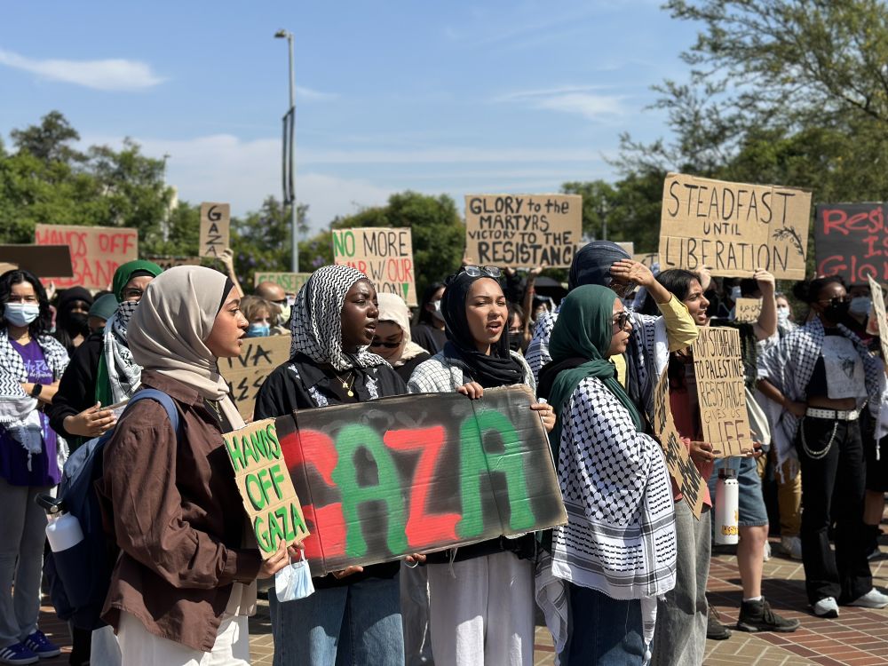 2024年10月7日,学生在美国南加州大学门外举行集会活动。新华社记者 黄恒 摄
