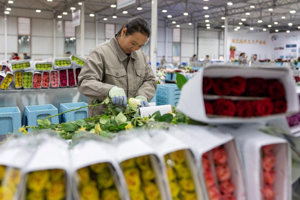 △近日,工作人员在云南丽江现代花卉产业园包装鲜花。