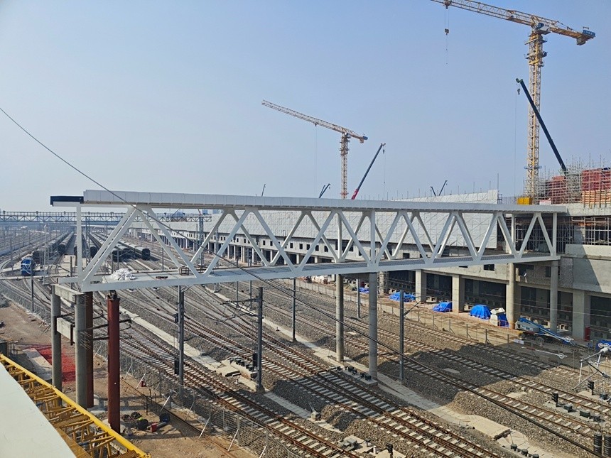 大朗客整所位于广州市白云区,距广州白云站约7公里,总用地面积23公顷,是一座大型的综合性客整所。作为广州铁路枢纽建设的核心项目,该客整所上盖开发综合体分为两部分,下部结构为44条各类线路,上部结构为预留住宅住房建设空间等。此次吊装的钢梁为大朗客整所增设市域站点工程人行天桥,是连接大朗客整所上部结构与信号楼的主要通道。