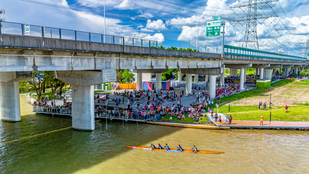 市民在天连悠享水畔桥下空间观看龙舟竞速