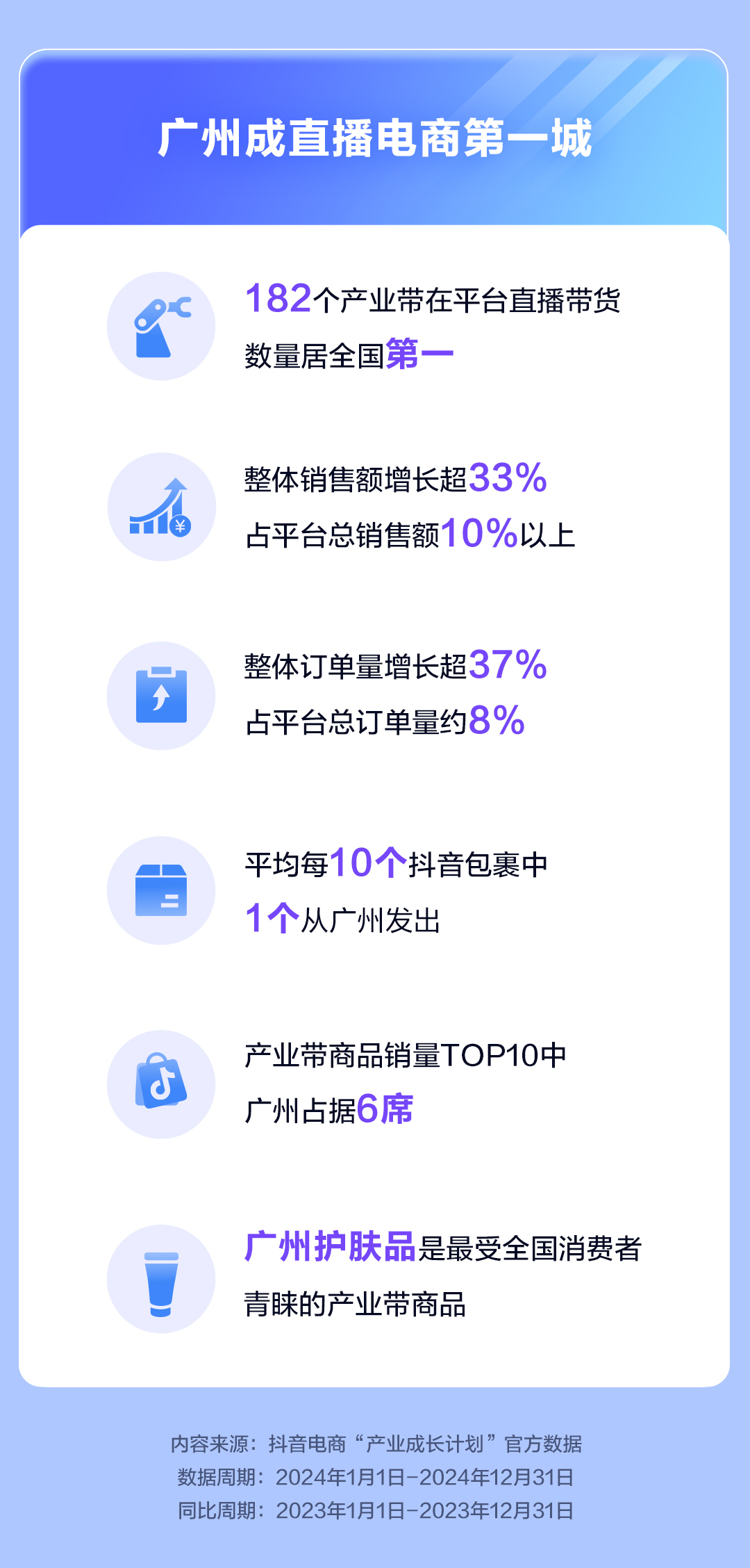 2024年,在抖音电商“产业成长计划”推动下,广州有182个产业带通过店播和货架等形式在该平台售货,数量居全国第一。其整体销售额较上一年增长超33%,占平台总销售额10%以上;整体订单量较上一年增长超37%,占平台总订单量约8%,平均每10个抖音包裹就有1个从广州发出。抖音电商销量排行榜前十中,来自广州产业带的商品占据6席,其中护肤品在直播间最为畅销,服装、箱包、鞋靴等也广受欢迎。