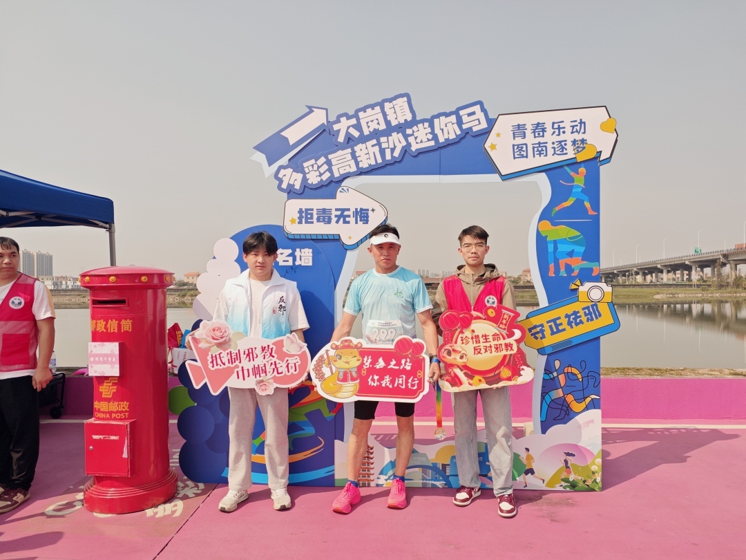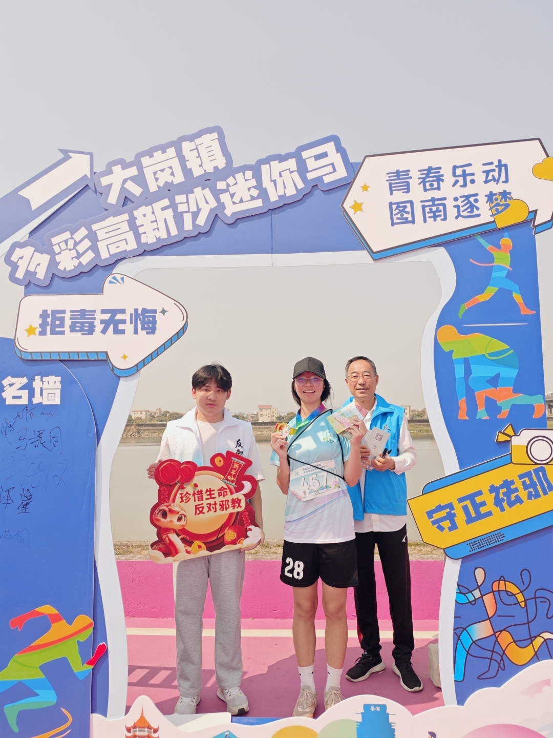 当冲过终点,高沙村“粉色慢行道”成为参赛者的勋章墙。终点处不远,互动打卡点引人注目。大岗镇“爱岗青年”群防志愿者们积极宣传,向参赛者和观众发放宣传手册,通过互动科普扫黑除恶,共建平安大岗等知识。参赛者纷纷在签名墙上留下姓名,在主题合影框前打卡。带孩子参赛的李女士说,孩子跑步后,还在互动中记住了“陌生人的糖果不能随便拿”的道理,强身健体之余思想认识也提高了。