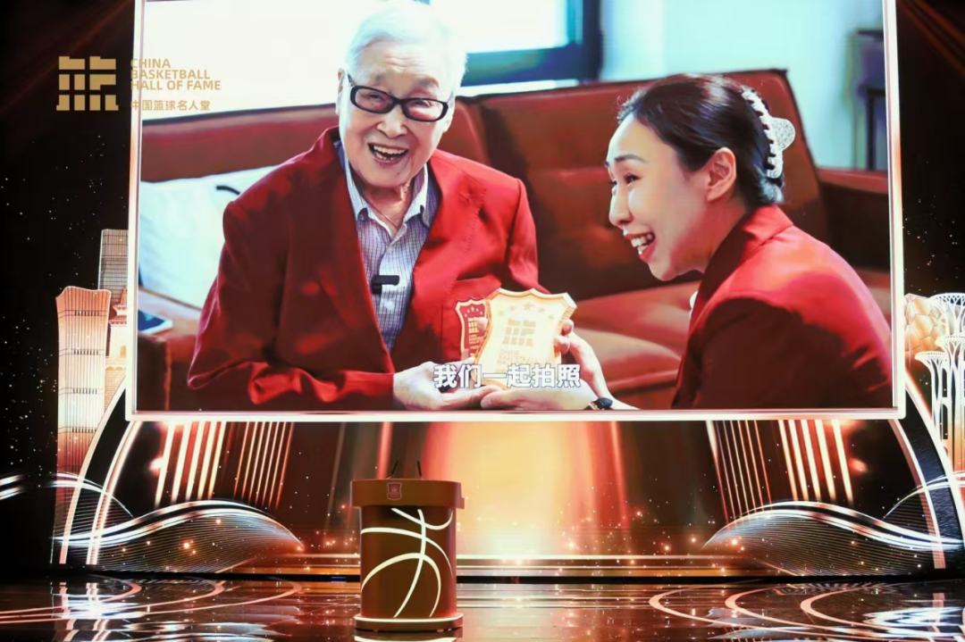 现年101岁的吴成章老人是李震中先生1948年奥运会的队友,虽然无法亲临现场,他仍通过视频表达了自己进入名人堂的喜悦。吴老之子吴忻水代父亲领取名人堂徽章,并分享了他们之间的“父子篮球”轶事。