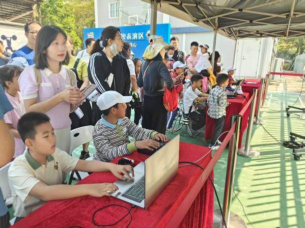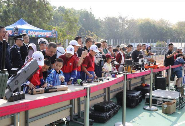 无人机飞控表演区吸引了众多科技爱好者。警用无人机在空中灵活飞行,展示了高科技在警务工作中的广泛应用。市民群众不仅看得津津有味,还在民警指导下亲自上手操控无人机,体验了一把“低空警务”的魅力。少警张同学兴奋地说:“我平时就喜欢玩无人机,但今天才知道它在警务工作中有这么多用途,太酷了!”