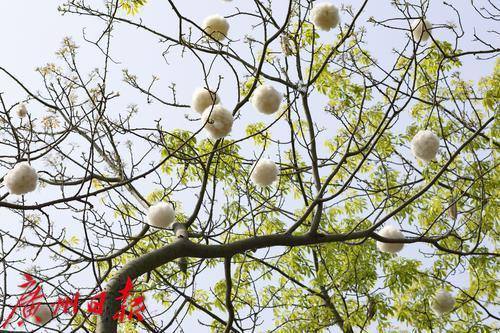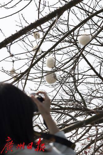 海珠湖,市民举起相机拍下如棉花一般的美丽异木棉棉絮。