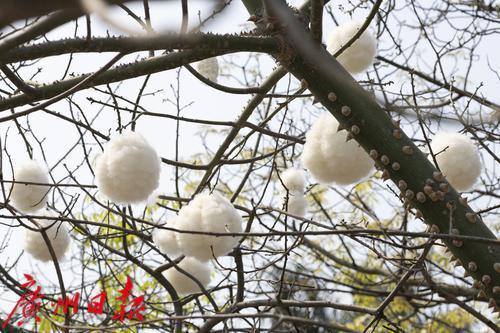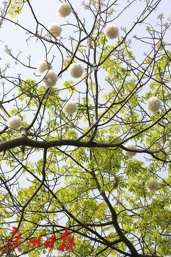 美丽异木棉的果实成熟裂开,里面如棉絮一般的絮状物挂在枝头。